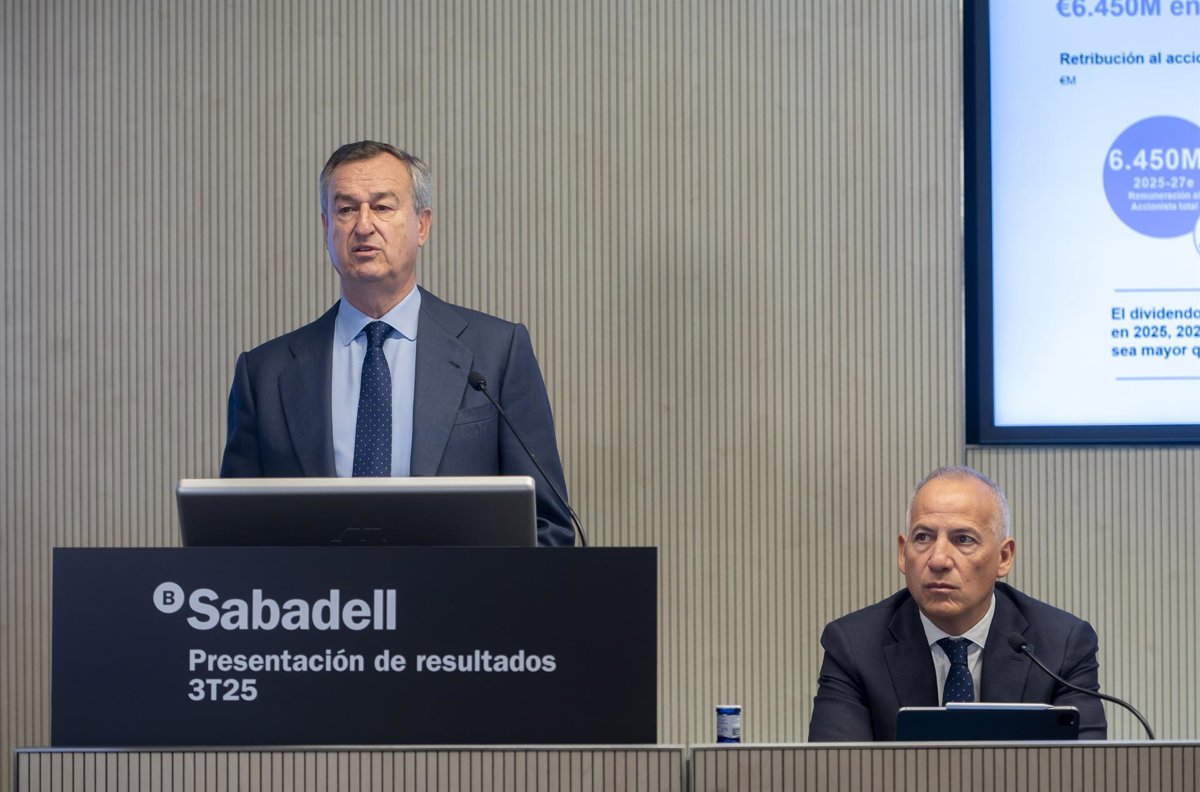 El consejero delegado del Banco Sabadell, César González-Bueno (i), y el director financiero del Banco Sabadell, Sergio Palavecino (d), durante una rueda de prensa, en la sede del Banco Sabadell, a 13 de noviembre de 2025, en Madrid (España). - Alberto Ortega - Europa Press