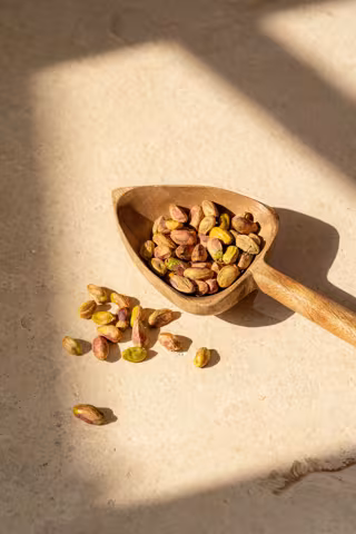 • Proteína completa para mantener la energía: Los pistachos son una fuente vegetal que aporta los 9 aminoácidos esenciales. La proteína contribuye al mantenimiento de la masa muscular y de los huesos en condiciones normales.
