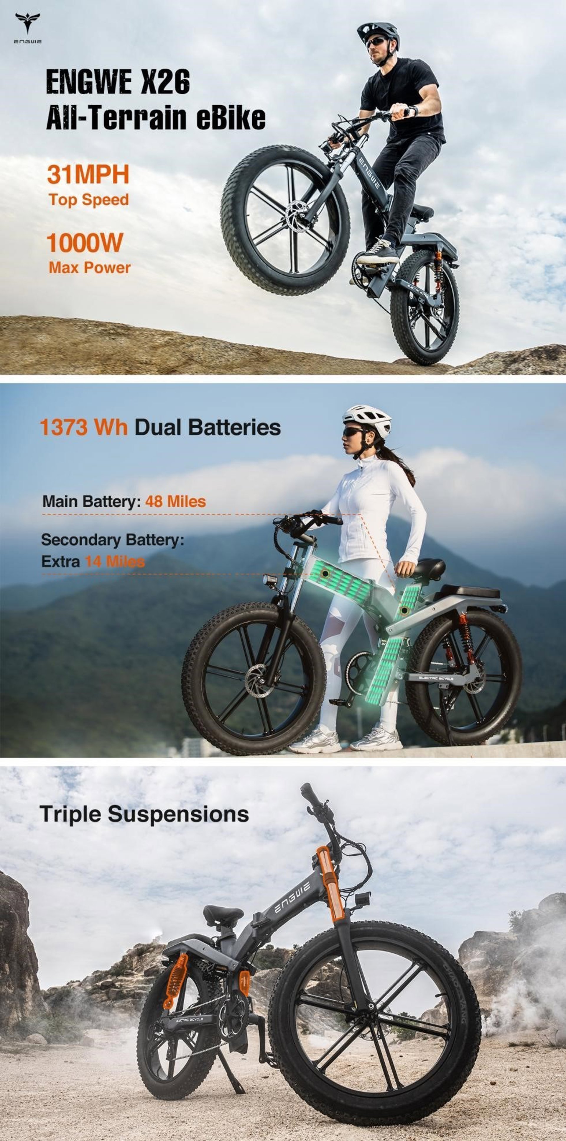 WALNUT, Calif. y ROMA, 14 de junio de 2022 /PRNewswire/ -- Con el objetivo de ser el producto más potente de la serie ENGWE para los usuarios de Estados Unidos y Europa, ENGWE emparejó un motor de 1000W con un sistema de batería dual, y una suspensión de triple choque para crear una bestia todo terreno X26 para el crowdfunding. Se ha lanzado en Indiegogo. Los neumáticos gordos de grado de motocicleta de 26*4 pulgadas facilitan el trabajo en los baches, la nieve o la arena. Más potente que la mayoría de las e-bikes del mercado, la X26 satisface fácilmente las expectativas de los conductores en cuanto a potencia, velocidad, largo recorrido y estabilidad.