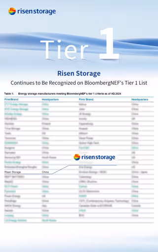NINGBO, China, 25 de octubre de 2024 /PRNewswire/ -- El 23 de octubre de 2024, BloombergNEF (BNEF) publicó su lista de fabricantes de almacenamiento de energía de nivel 1 a escala mundial del cuarto trimestre de 2024, en la que Risen Energy Storage ha sido reconocido una vez más como fabricante de almacenamiento de energía de nivel 1 a nivel mundial. Esta distinción destaca el compromiso de Risen de ofrecer productos superiores, un rendimiento excepcional en los proyectos y la construcción de una marca global de confianza.