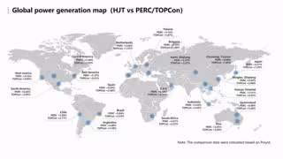 Globalmente, los productos con tecnología HJT tienen una mayor generación de energía, que es entre un 4,37% y un 6,54% superior a la de PERC y entre un 1,25% y un 3,33% superior a la de TOPCon. y su rendimiento de generación de energía es más destacado especialmente en las regiones de alta temperatura (por ejemplo, Oriente Medio, Australia y el sur de EE.UU.), con un aumento del 6% en comparación con PERC y del 3% en comparación con TOPCon. Como se muestra en la figura 1.1.