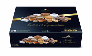 La caja de 3 kilos ofrece 18 variedades excepcionales que recogen la esencia de la Navidad en cada pieza. Entre sus especialidades destacan: