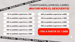 Del 14 al 30 de noviembre, los clientes podrán beneficiarse de una promoción diseñada para maximizar el ahorro: Por cada 50 euros gastados, se aplica una rebaja directa de 5 euros, sin límite máximo. De este modo, pedidos de 100 euros obtendrán 10 euros de descuento, y compras de 1.000 euros alcanzarán los 100 euros de ahorro. Todo ello bajo el lema "Cuanto más compres, más ahorras". Además, por compras superiores a 1.000 euros se aplicará un 10% directo, que se eleva al 20% para los clientes que cuentan con la suscripción premium.