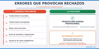 Una traducción no jurada, incompleta o sin apostilla puede provocar el rechazo o archivo de una solicitud de regularización, incluso si se presenta dentro de plazo.